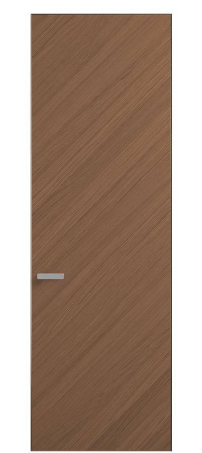 Полотно Рифт в скрытом алюминиевом коробе становится полноценным элементом декора. В коллекции представлено 9 моделей дверей в высоте до 3 метров. Рисунок раскладки шпона варьируется от простого до сложного. «Рубашка» для каждого полотна подбирается вручную по цвету, текстуре и фактуре.